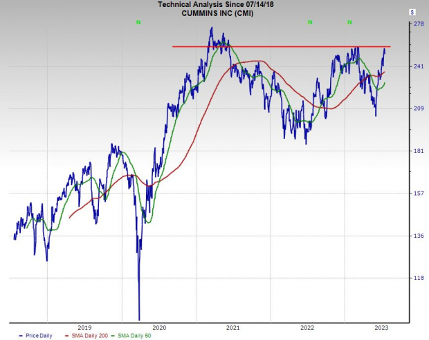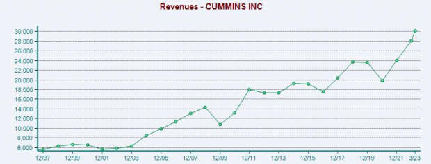 Zacks estimates call for CMI’s sales to climb another 17% in 2023 to reach nearly $33 billion. Meanwhile, its adjusted earnings are projected to soar 31% this year to $19.80 a share.