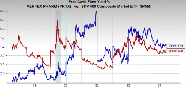 VRTX has an FCF yield of 4.2%, which is above the broad market average of 4.1%. Additionally, we can see that free cash flow has become a priority for the company as it was not net profitable until 2016, however since then annual FCF has grown from just $180 million to $3.9 billion in the trailing twelve months.