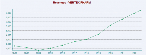 Sales growth at Vertex Pharmaceuticals has exploded over the last decade, propelling the company to positive Free Cash Flow. Sales over the last ten years have grown at an incredible CAGR of 32%.