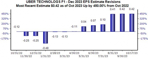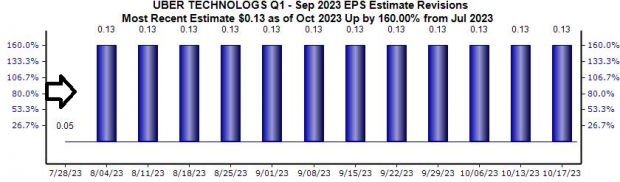 To touch further on the release expected on November 7th, the Zacks Consensus EPS Estimate of $0.13 reflects a change of +120% from the year-ago period. Analysts raised their expectations notably for the print following Uber’s latest release in early August and have remained unchanged since.