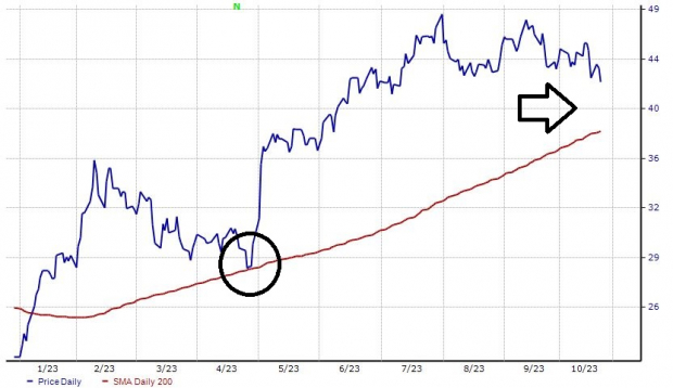 It’s also worth noting that shares have respected their 200-day daily moving average, finding buyers at the level in late April. Given the recent volatility in the market and sideways action of shares over the last several months, this level could potentially be re-tested in the coming periods.