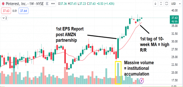 Last quarter, PINS shares soared nearly 20% on volume five times the norm – a sign that institutions were accumulating shares. Currently, PINS is retreating to the 10-week moving average for the first time since its massive breakout – an area of asymmetric reward-to-risk.