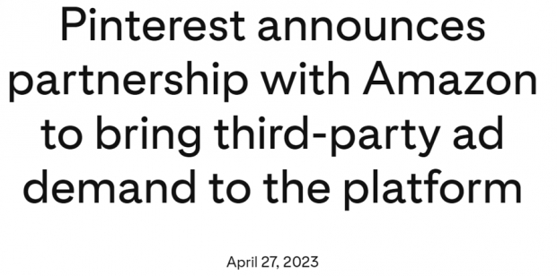 “Today we’re announcing that we’re opening up third-party ad demand on Pinterest. As user engagement with shoppable content on Pinterest continues to grow, we’re pleased to have selected Amazon (AMZN) as our first partner for third-party ads.”
