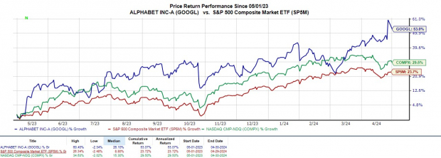 This has now led to a +17% year-to-date surge in Alphabet’s stock which has impressively topped the S&P 500’s +8% and the Nasdaq’s +4%. Furthermore, GOOGL has noticeably outperformed the broader indexes over the last year.