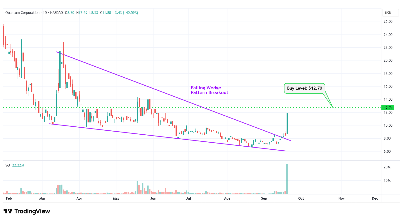 10 | Quantum Corp | NASDAQ: QMCO | $11.88 | $12.70 | Falling Wedge Pattern Breakout |