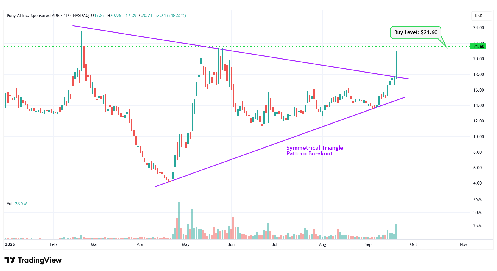 1 | Pony AI Inc. ADR | NASDAQ: PONY | $20.70 | $21.60 | Symmetrical Triangle Pattern Breakout |