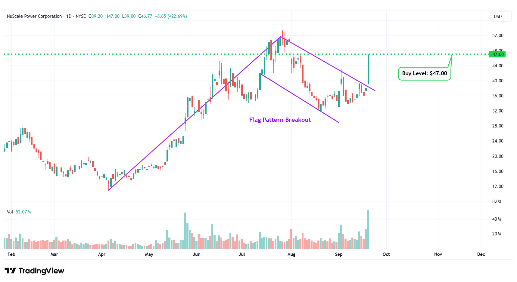 2 | NuScale Power Corporation | NYSE: SMR | $46.77 | $47.00 | Flag Pattern Breakout |