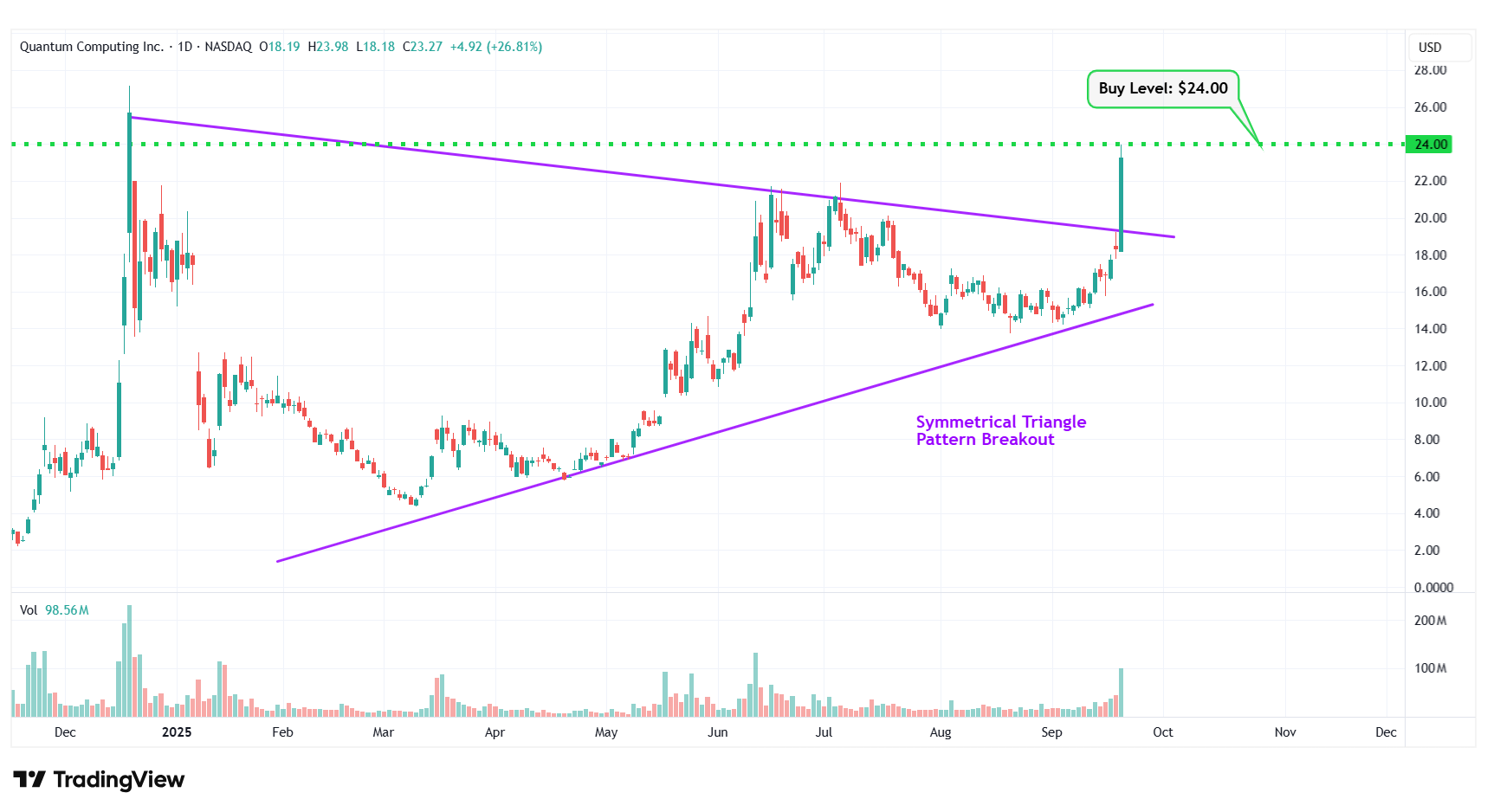3 | Quantum Computing Inc. | NASDAQ: QUBT | $23.27 | $24.00 | Symmetrical Triangle Pattern Breakout |