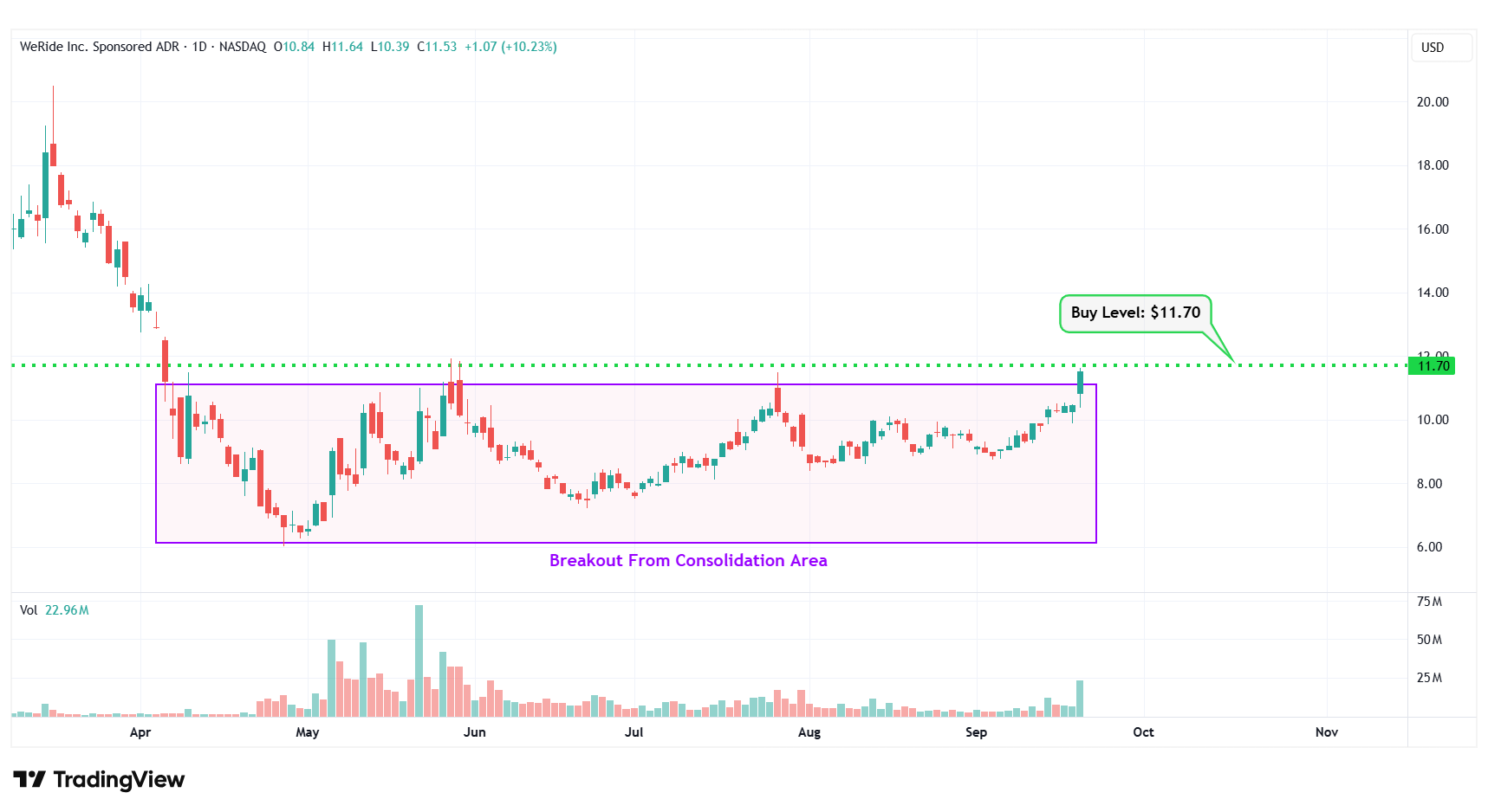 4 | WeRide Inc. ADR | NASDAQ: WRD | $11.53 | $11.70 | Breakout From Consolidation Area |
