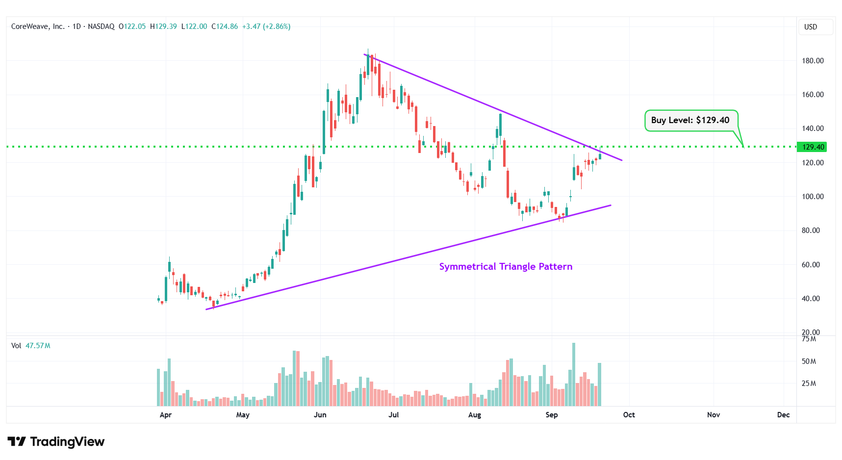 5 | CoreWeave Inc. | NASDAQ: CRWV | $124.86 | $129.40 | Symmetrical Triangle Pattern |