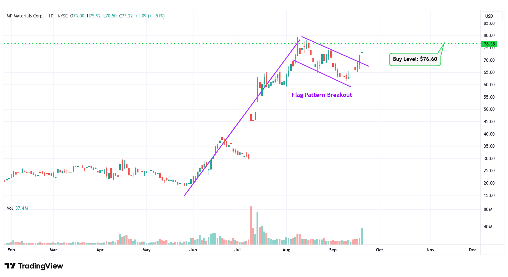 6 | MP Materials Corporation | NYSE: MP | $73.22 | $76.60 | Flag Pattern Breakout |