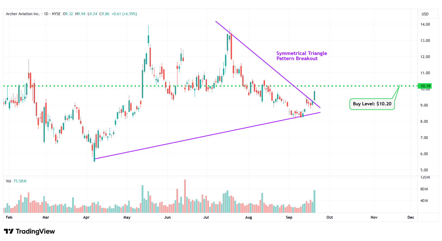 7 | Archer Aviation Inc. | NYSE: ACHR | $9.86 | $10.20 | Symmetrical Triangle Pattern Breakout |