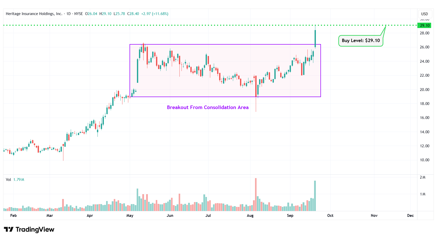 8 | Heritage Insurance Holdings Inc. | NYSE: HRTG | $28.40 | $29.10 | Breakout From Consolidation Area |
