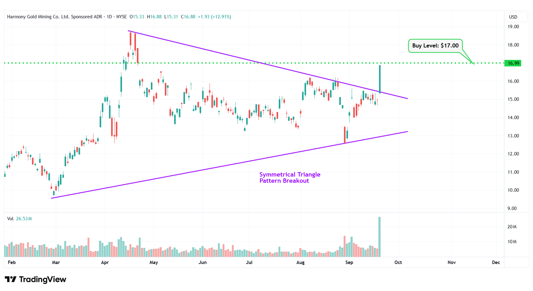 9 | Harmony Gold Mining Co Ltd ADR | NYSE: HMY | $16.88 | $17.00 | Symmetrical Triangle Pattern Breakout |