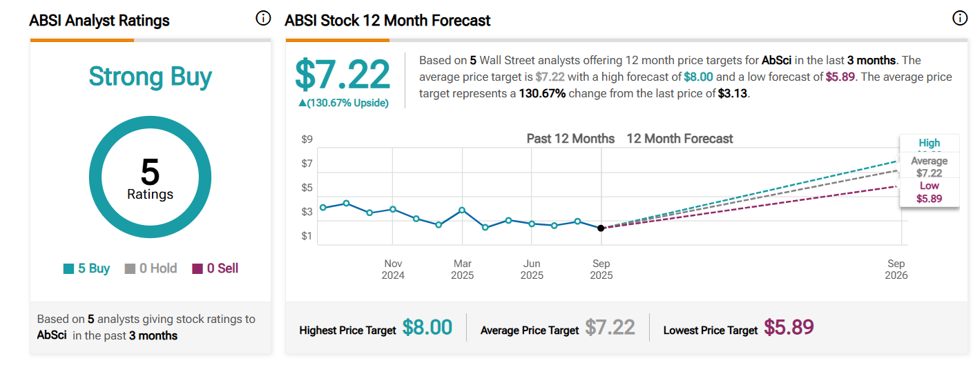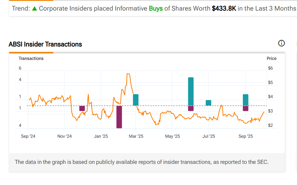 Analyst Consensus: As per TipRanks Analytics, based on 5 Wall Street analysts offering 12-month price targets for ABSI in the last 3 months, the stock has an average price target of $7.22, which is nearly 131% upside from current levels.
