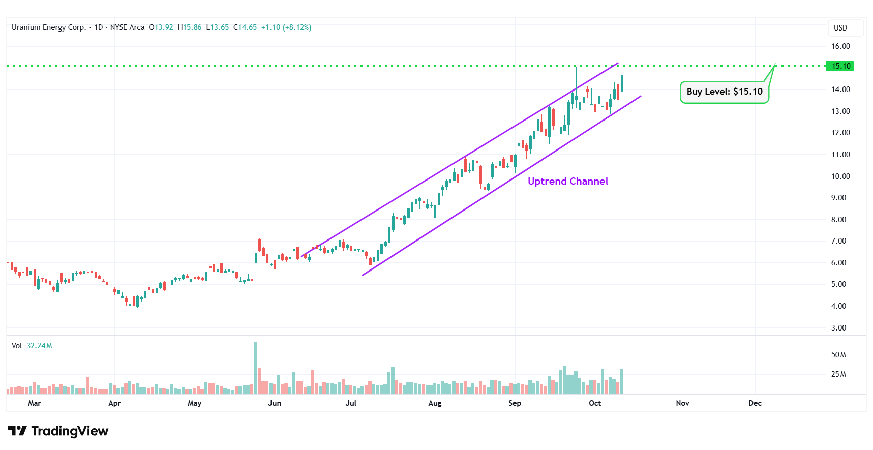 10 | Uranium Energy Corp | AMEX: UEC | $14.65 | $15.10 | Uptrend Channel |