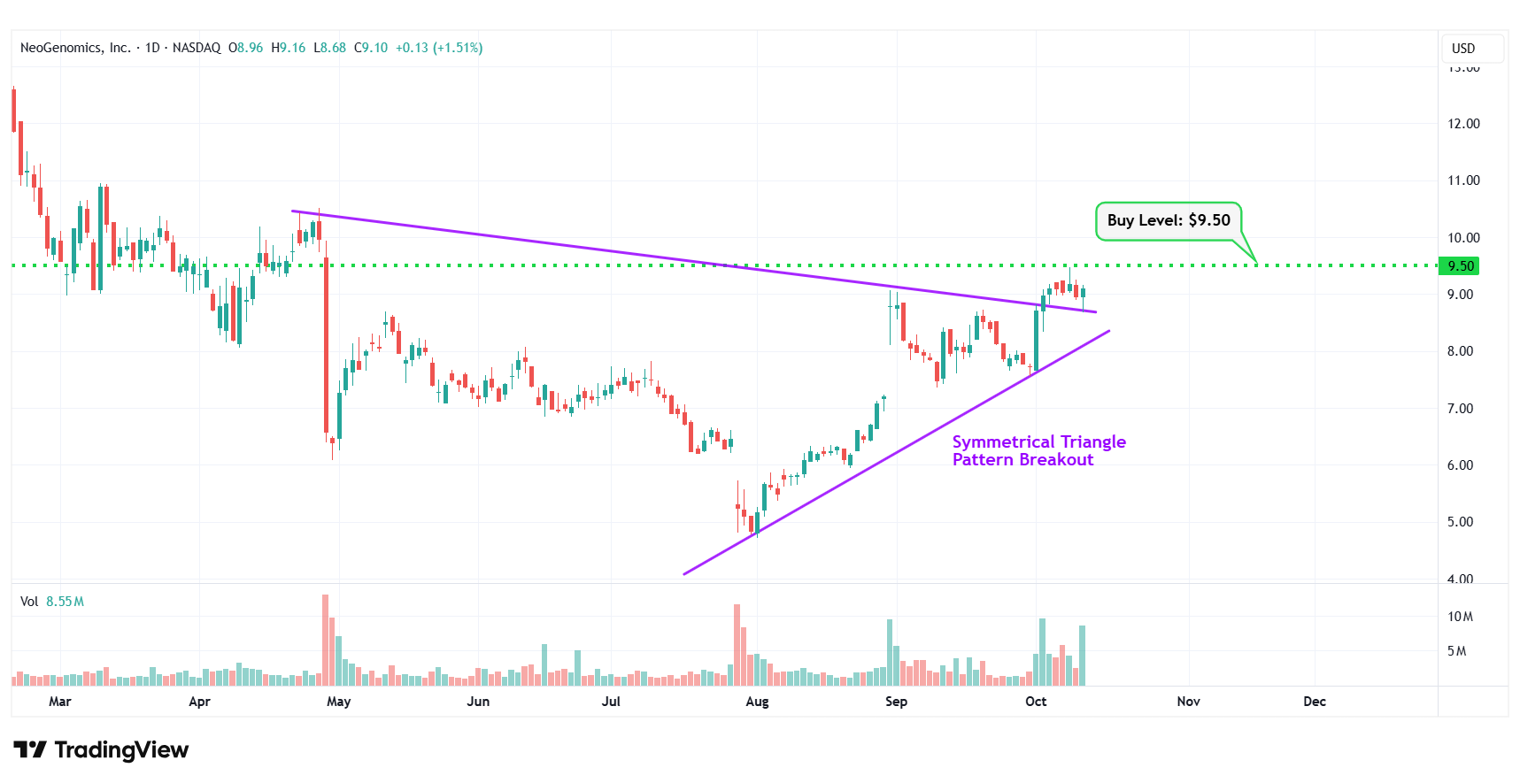 2 | Neogenomics Inc. | NASDAQ: NEO | $9.10 | $9.50 | Symmetrical Triangle Pattern Breakout |