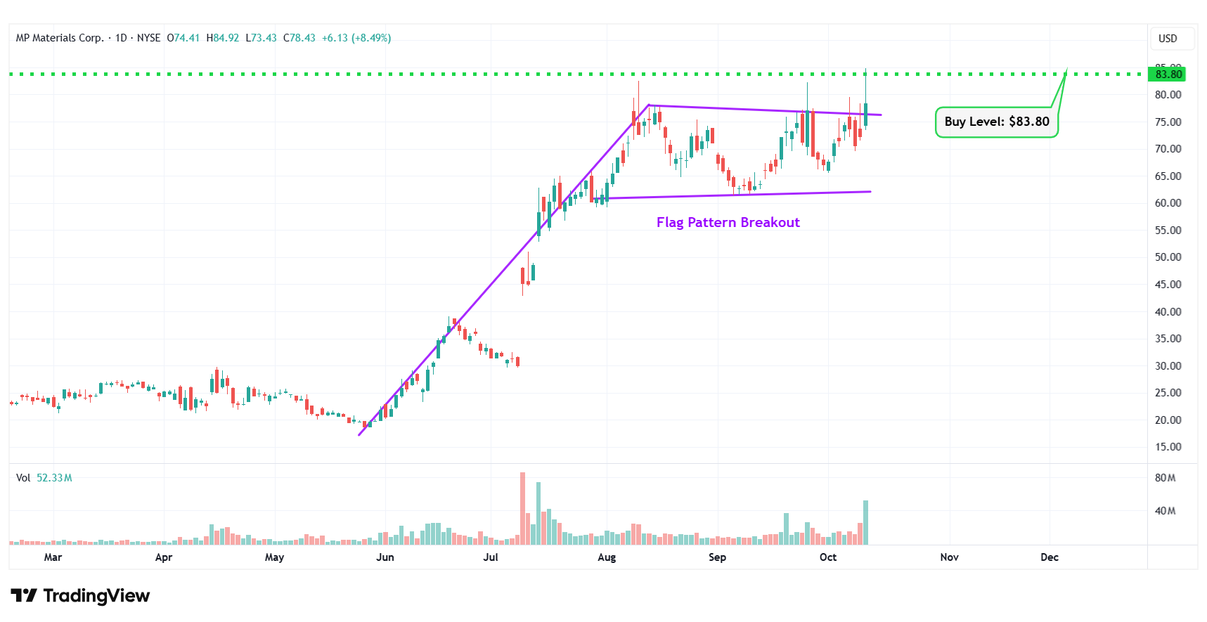 3 | MP Materials Corporation | NYSE: MP | $78.43 | $83.80 | Flag Pattern Breakout |