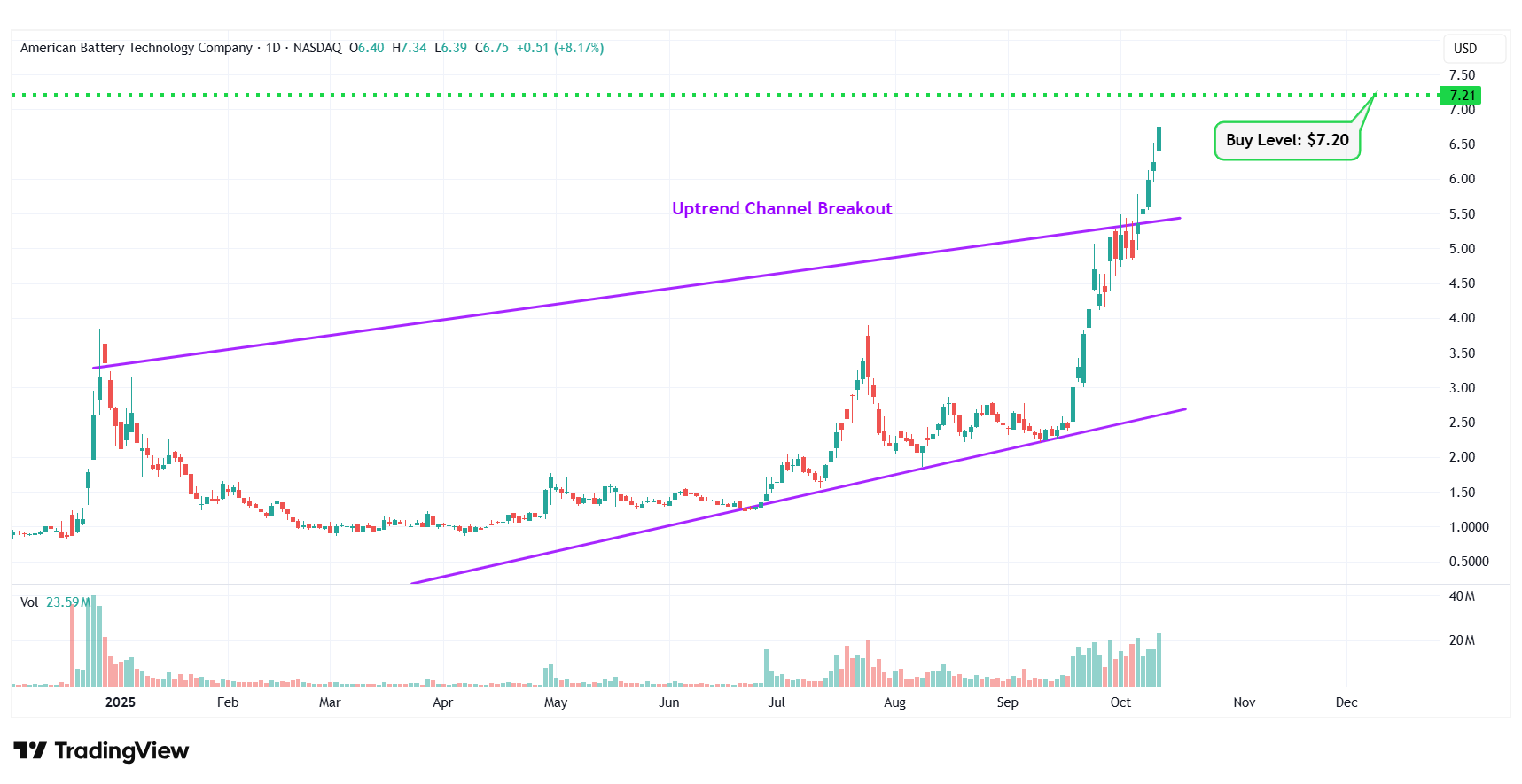 4 | American Battery Technology Company | NASDAQ: ABAT | $6.75 | $7.20 | Uptrend Channel Breakout |