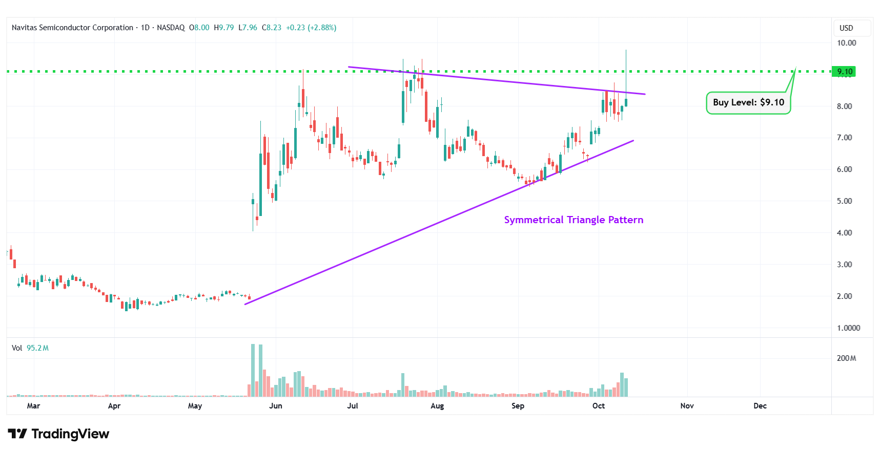 5 | Navitas Semiconductor Corp | NASDAQ: NVTS | $8.23 | $9.10 | Symmetrical Triangle Pattern |