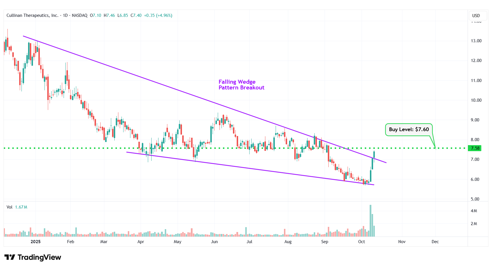6 | Cullinan Therapeutics Inc. | NASDAQ: CGEM | $7.40 | $7.60 | Falling Wedge Pattern Breakout |