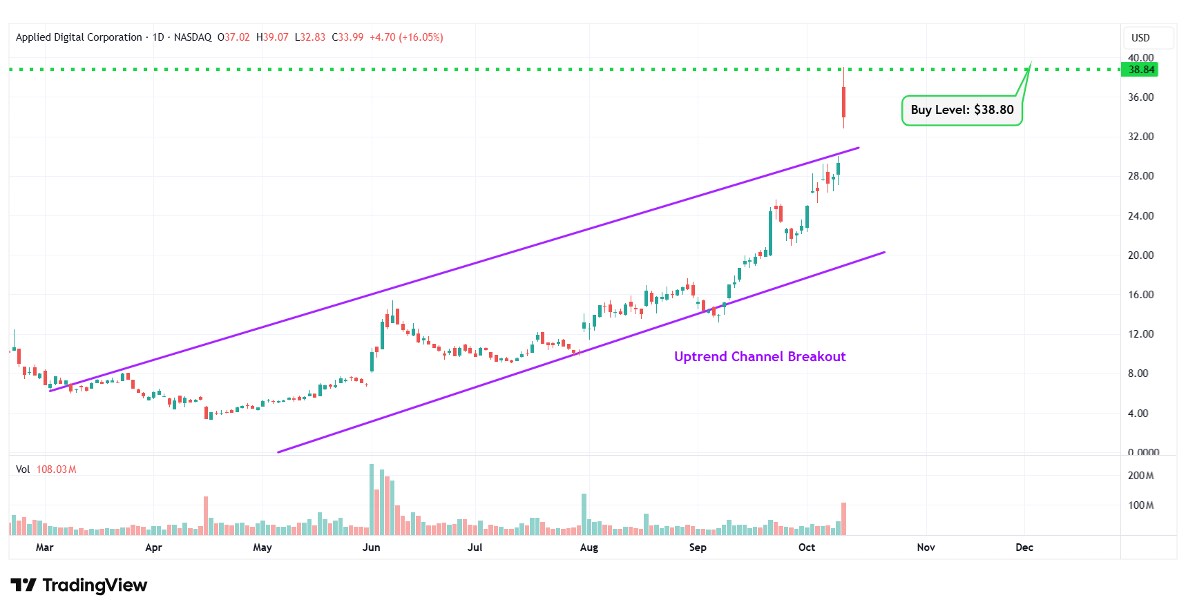 7 | Applied Digital Corporation | NASDAQ: APLD | $33.99 | $38.80 | Uptrend Channel Breakout |