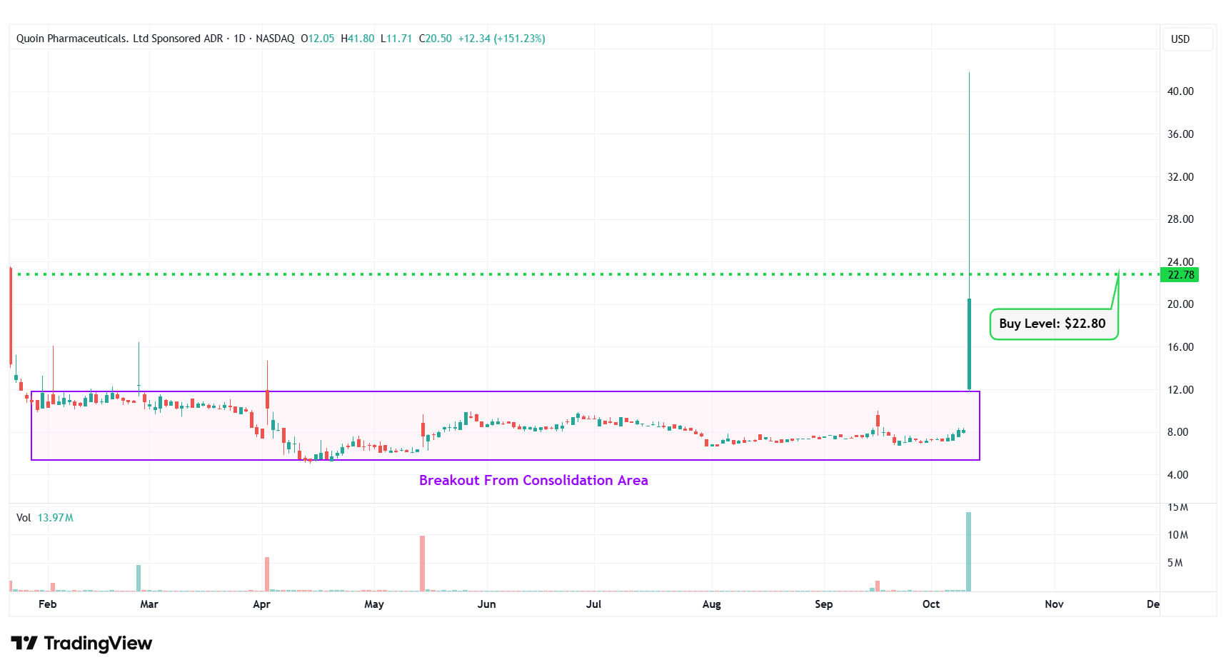 8 | Quoin Pharmaceuticals Ltd ADR | NASDAQ: QNRX | $20.50 | $22.80 | Breakout From Consolidation Area |