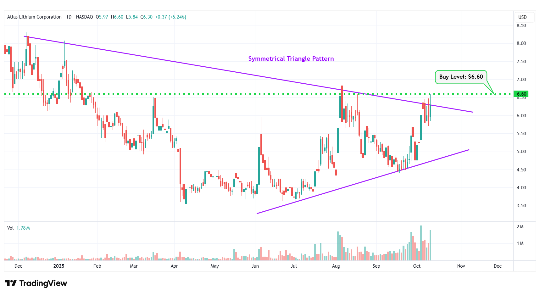 9 | Atlas Lithium Corporation | NASDAQ: ATLX | $6.30 | $6.60 | Symmetrical Triangle Pattern |