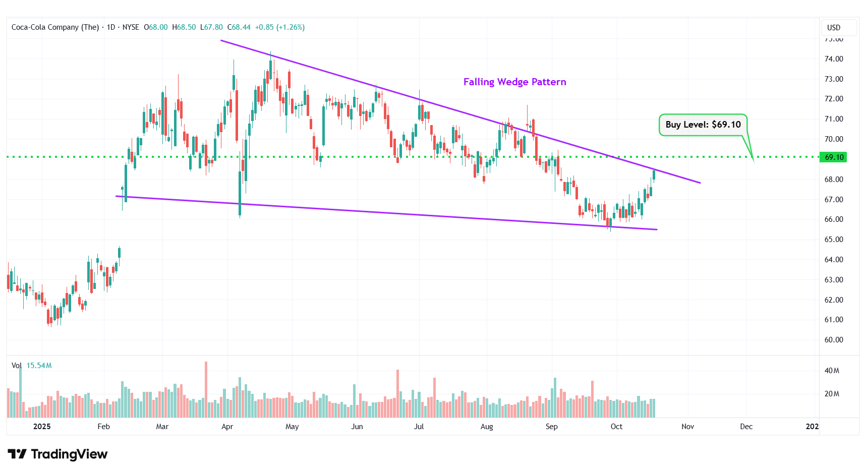 10 | Coca-Cola Co | NYSE: KO | $68.44 | $69.10 | Falling Wedge Pattern |