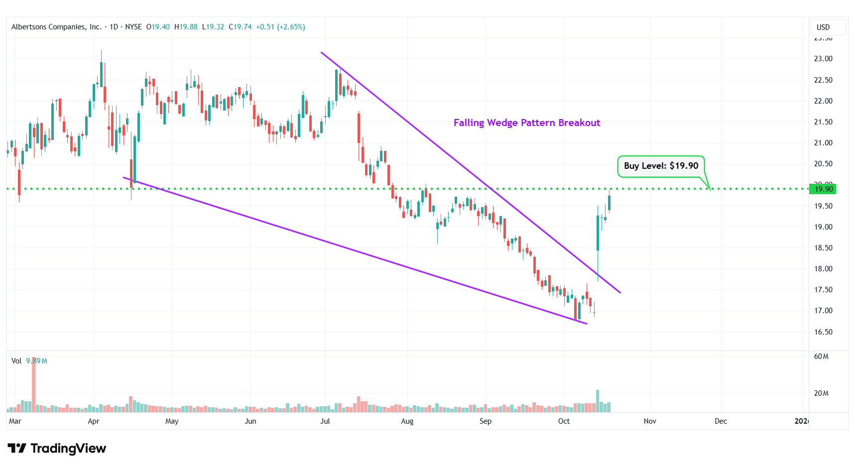 1 | Albertsons Companies Inc. | NYSE: ACI | $19.74 | $19.90 | Falling Wedge Pattern Breakout |