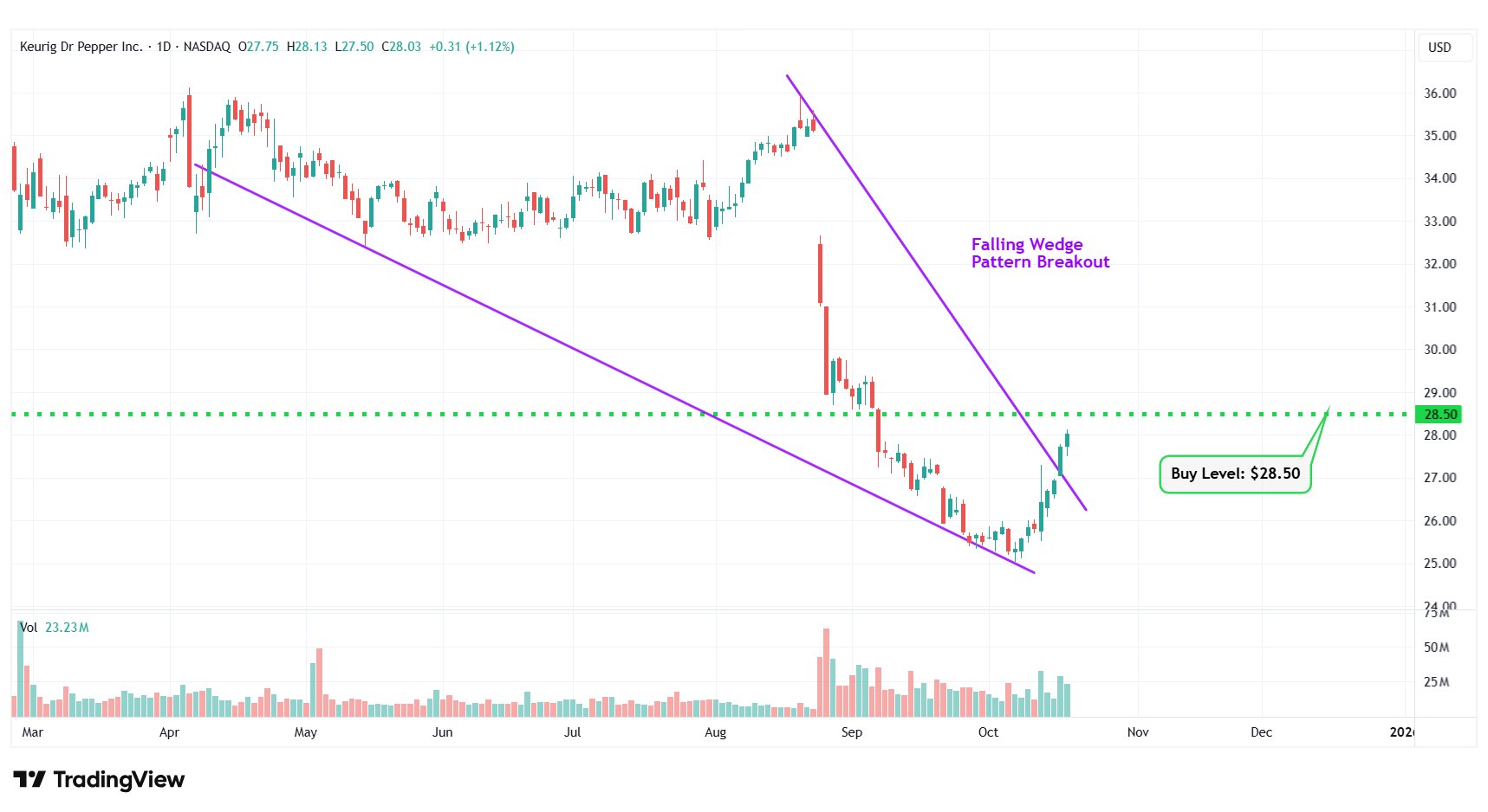 3 | Keurig Dr Pepper Inc. | NASDAQ: KDP | $28.03 | $28.50 | Falling Wedge Pattern Breakout |