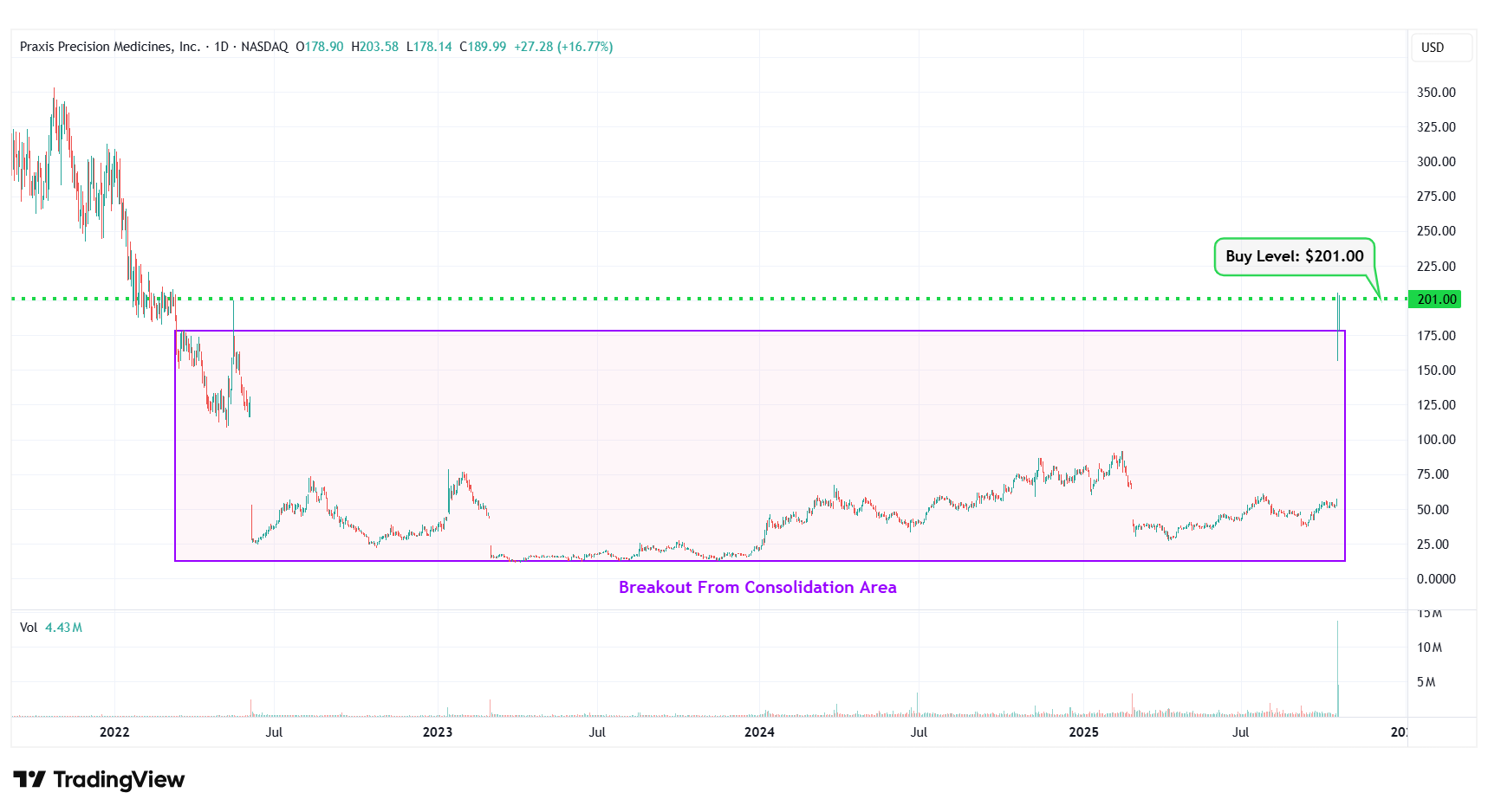 4 | Praxis Precision Medicines Inc. | NASDAQ: PRAX | $189.99 | $201.00 | Breakout From Consolidation Area |