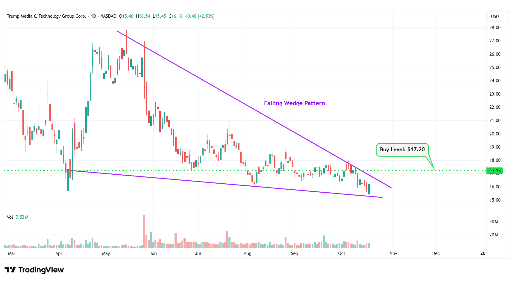 5 | Trump Media & Technology Group Corp | NASDAQ: DJT | $16.18 | $17.20 | Falling Wedge Pattern |