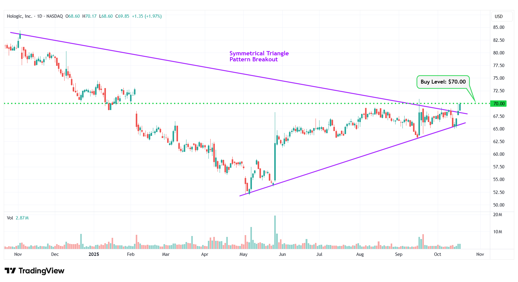6 | Hologic, Inc. | NASDAQ: HOLX | $69.85 | $70.00 | Symmetrical Triangle Pattern Breakout |