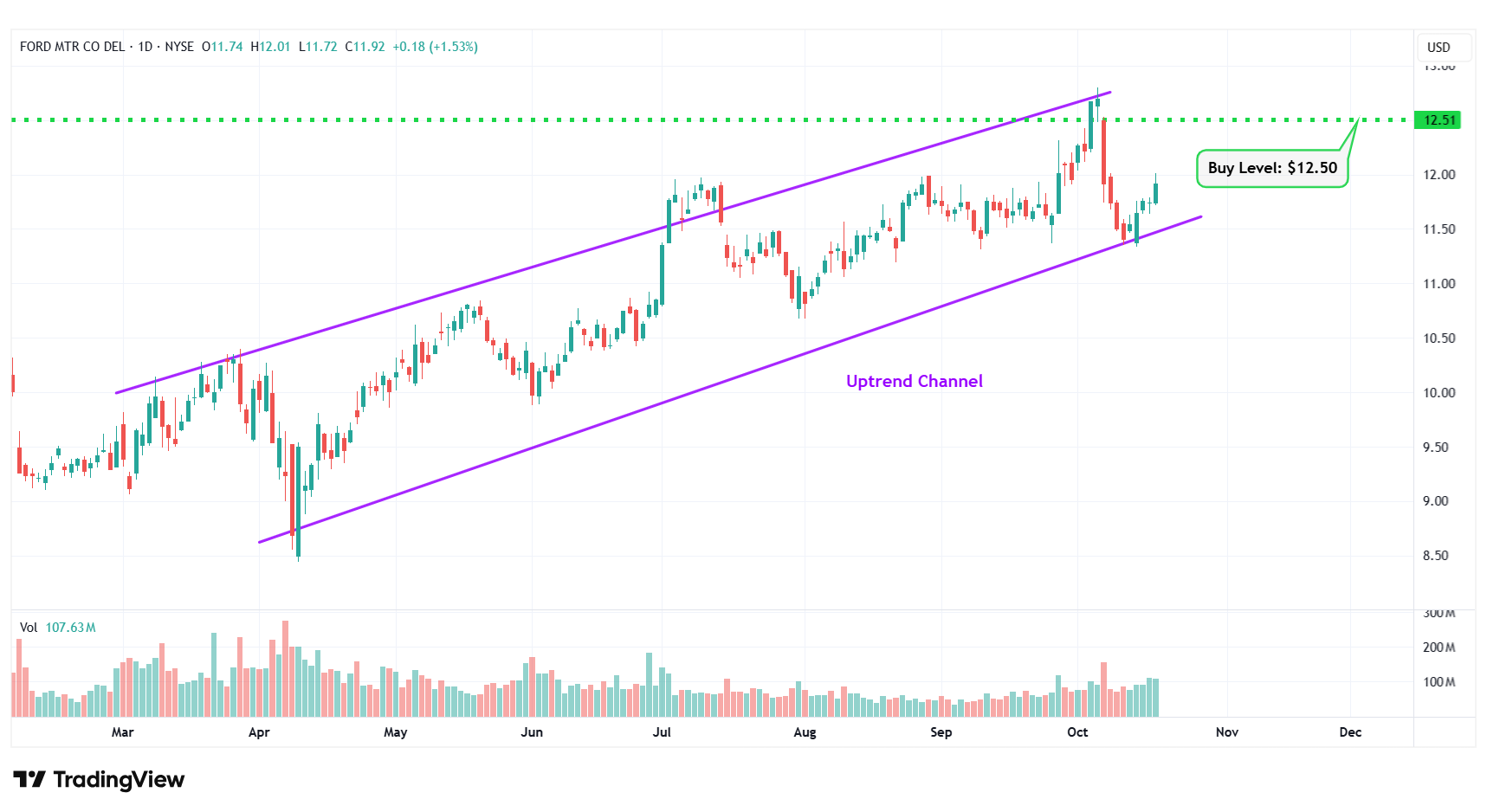 7 | Ford Motor Co | NYSE: F | $11.92 | $12.50 | Uptrend Channel |
