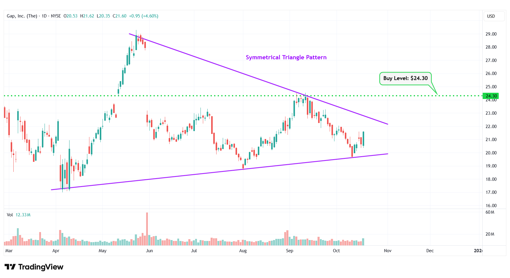 8 | Gap, Inc. | NYSE: GAP | $21.60 | $24.30 | Symmetrical Triangle Pattern |