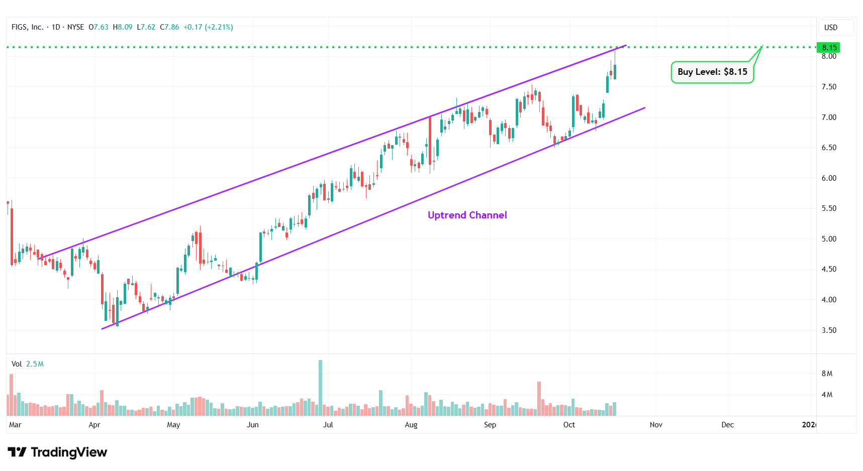 9 | Figs Inc. | NYSE: FIGS | $7.86 | $8.15 | Uptrend Channel |
