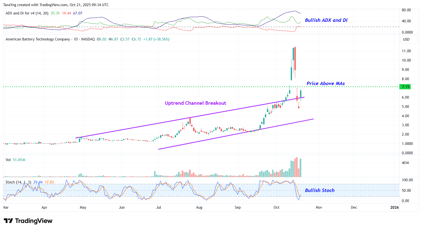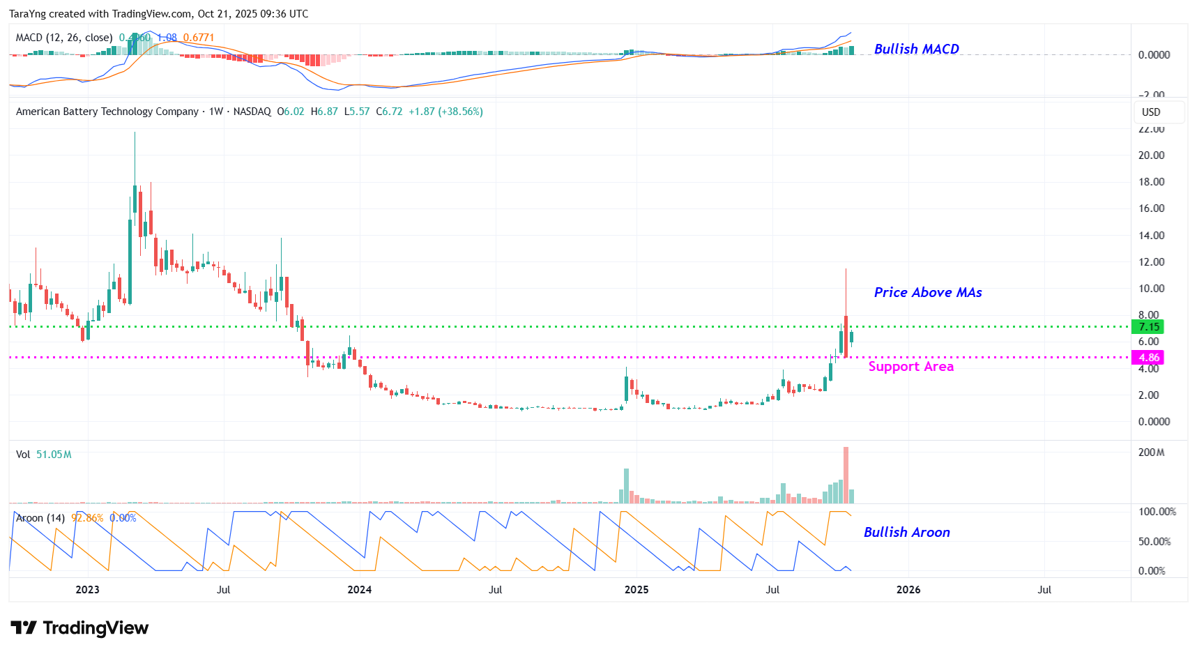 American Battery Technology Company (NASDAQ: ABAT) seems poised for a price surge based on its latest charts. The company operates as a battery materials company in the United States. It explores for resources of battery metals, such as lithium, nickel, cobalt, and manganese; and develops and commercializes technologies for the extraction and refining of battery metals.