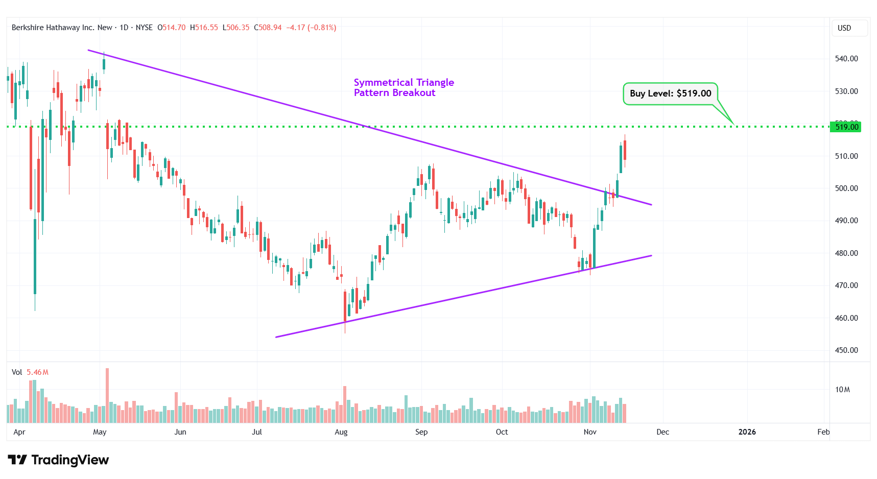 | 10 | Berkshire Hathaway Inc. | NYSE: BRK.B | $508.94 | $519.00 | Symmetrical Triangle Pattern Breakout |