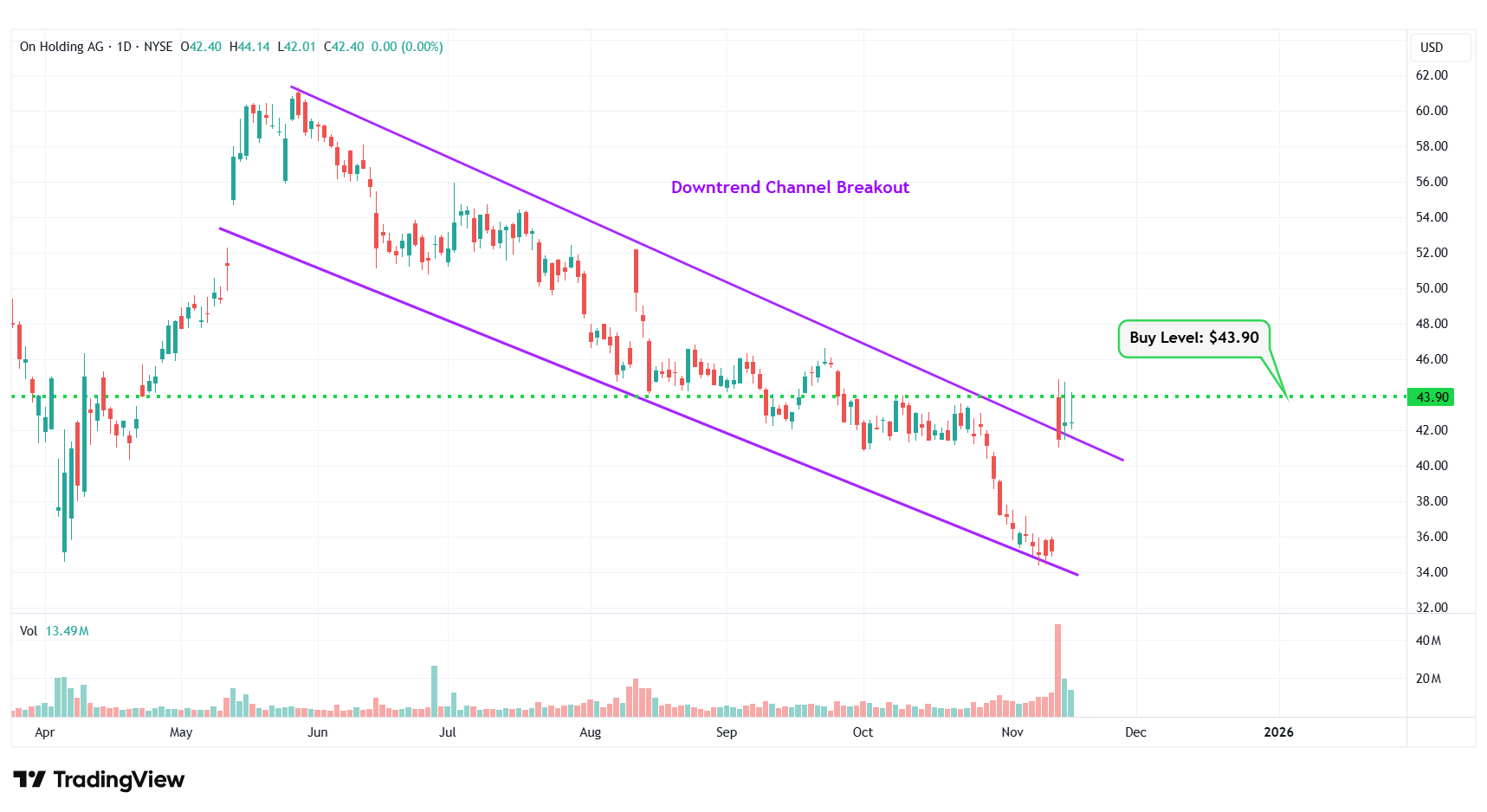 | 1 | On Holding AG | NYSE: ONON | $42.40 | $43.90 | Downtrend Channel Breakout |