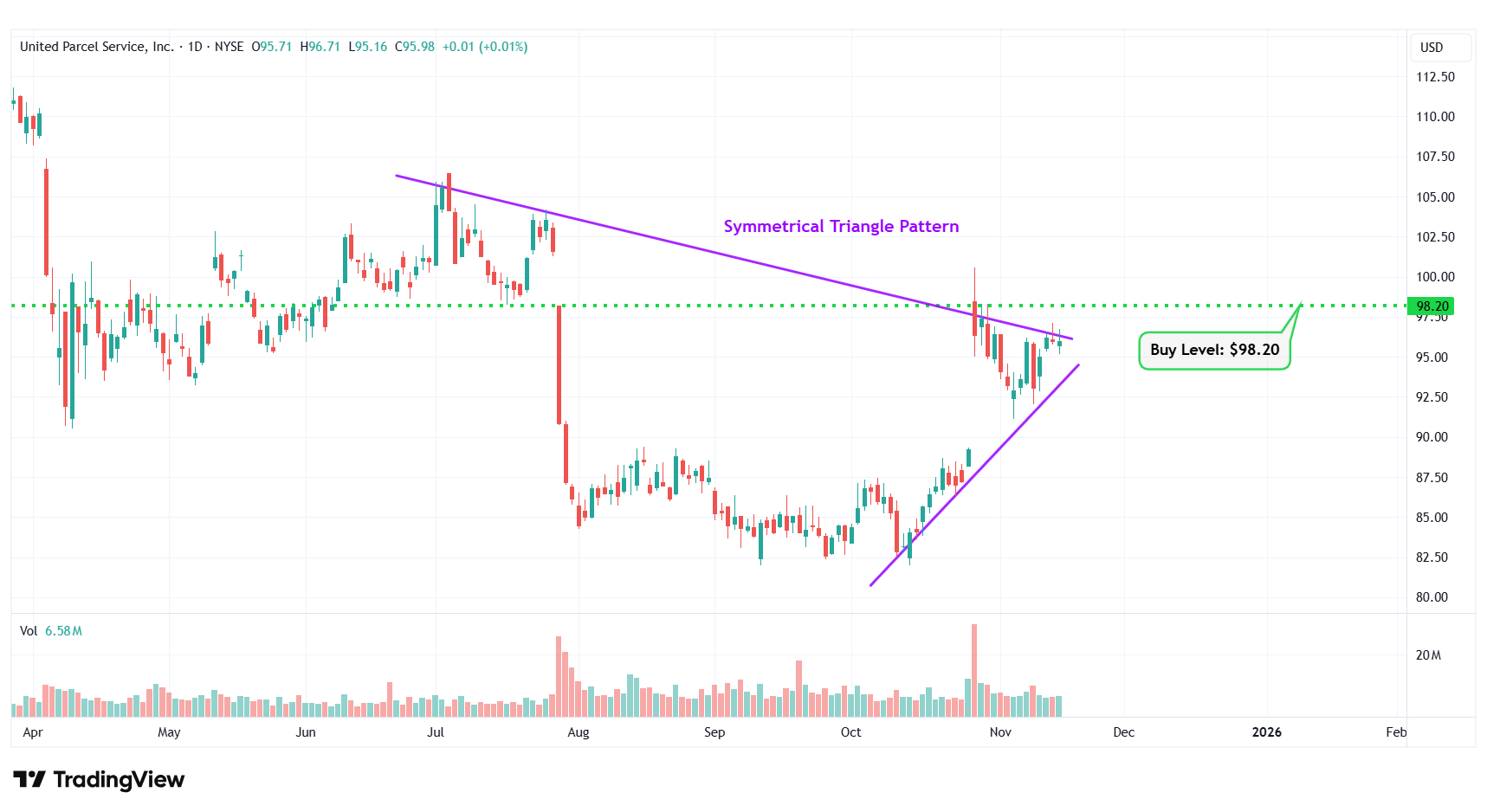 | 3 | United Parcel Service, Inc. | NYSE: UPS | $95.98 | $98.20 | Symmetrical Triangle Pattern |