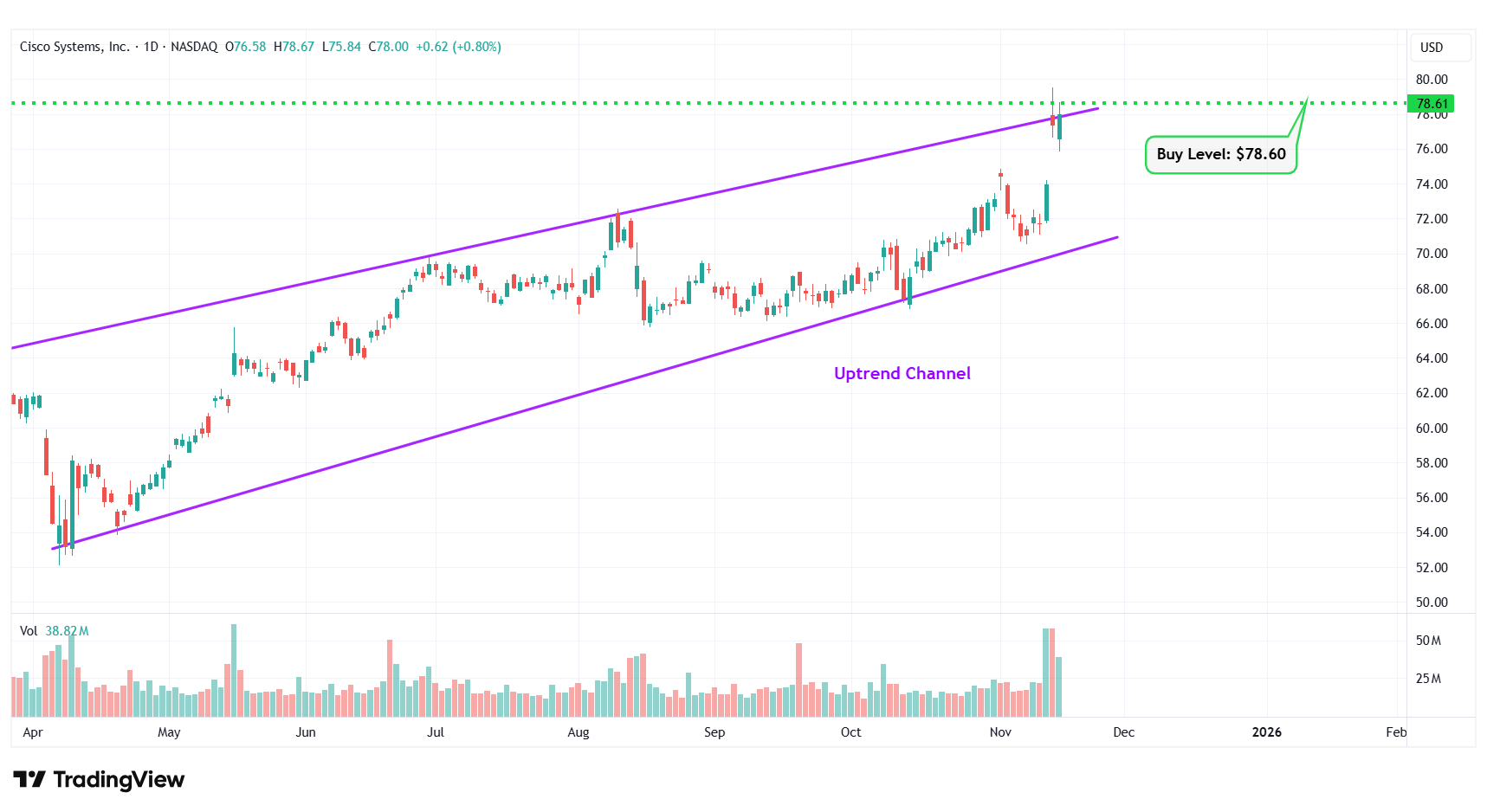 | 4 | Cisco Systems, Inc. | NASDAQ: CSCO | $78.00 | $78.60 | Uptrend Channel |