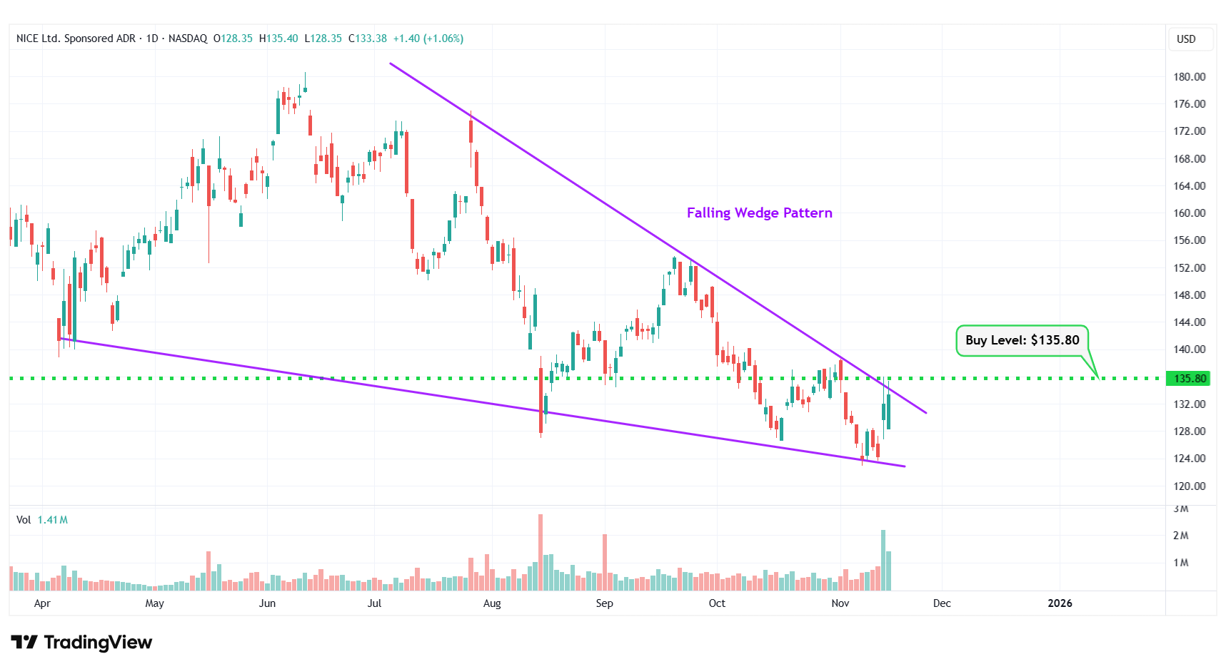 | 5 | NICE Ltd ADR | NASDAQ: NICE | $133.38 | $135.80 | Falling Wedge Pattern |