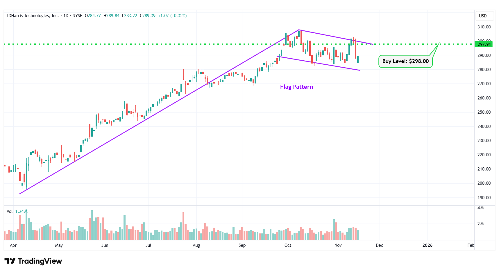 | 6 | L3Harris Technologies Inc. | NYSE: LHX | $289.39 | $298.00 | Flag Pattern |