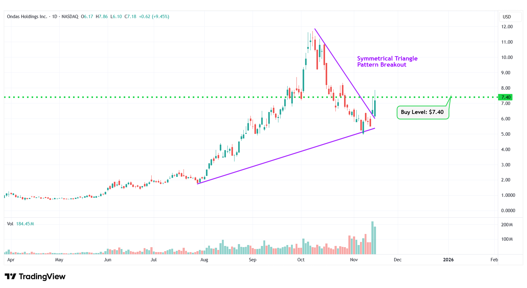 | 7 | Ondas Holdings Inc. | NASDAQ: ONDS | $7.18 | $7.40 | Symmetrical Triangle Pattern Breakout |