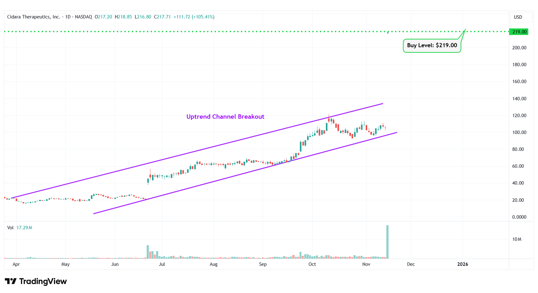| 8 | Cidara Therapeutics Inc. | NASDAQ: CDTX | $217.71 | $219.00 | Uptrend Channel Breakout |