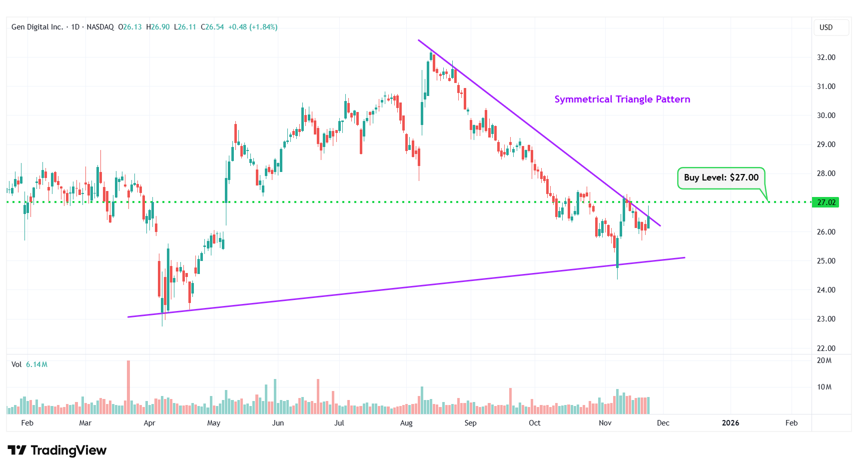 | 10 | Gen Digital Inc. | NASDAQ: GEN | $26.54 | $27.00 | Symmetrical Triangle Pattern |
