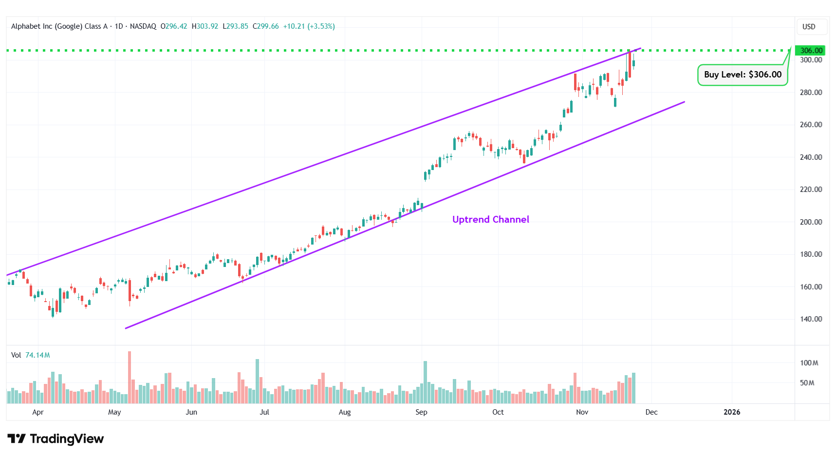 | 2 | Alphabet Inc. | NASDAQ: GOOGL | $299.66 | $306.00 | Uptrend Channel |