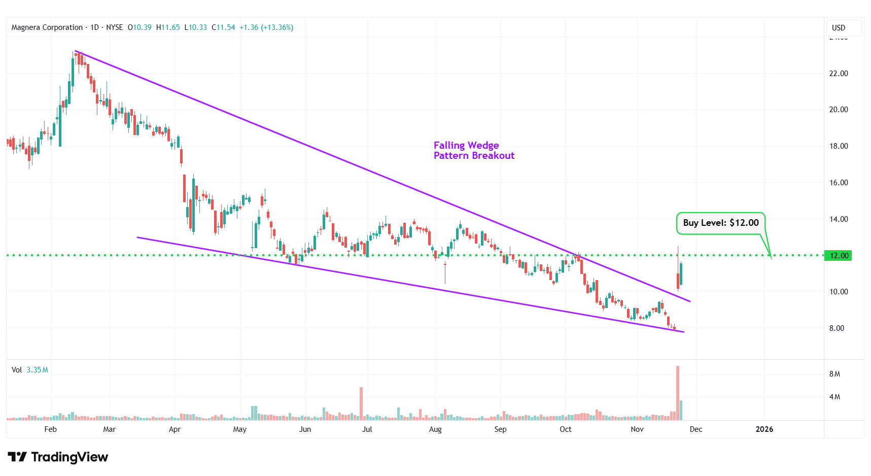 | 3 | Magnera Corp. | NYSE: MAGN | $11.54 | $12.00 | Falling Wedge Pattern Breakout |