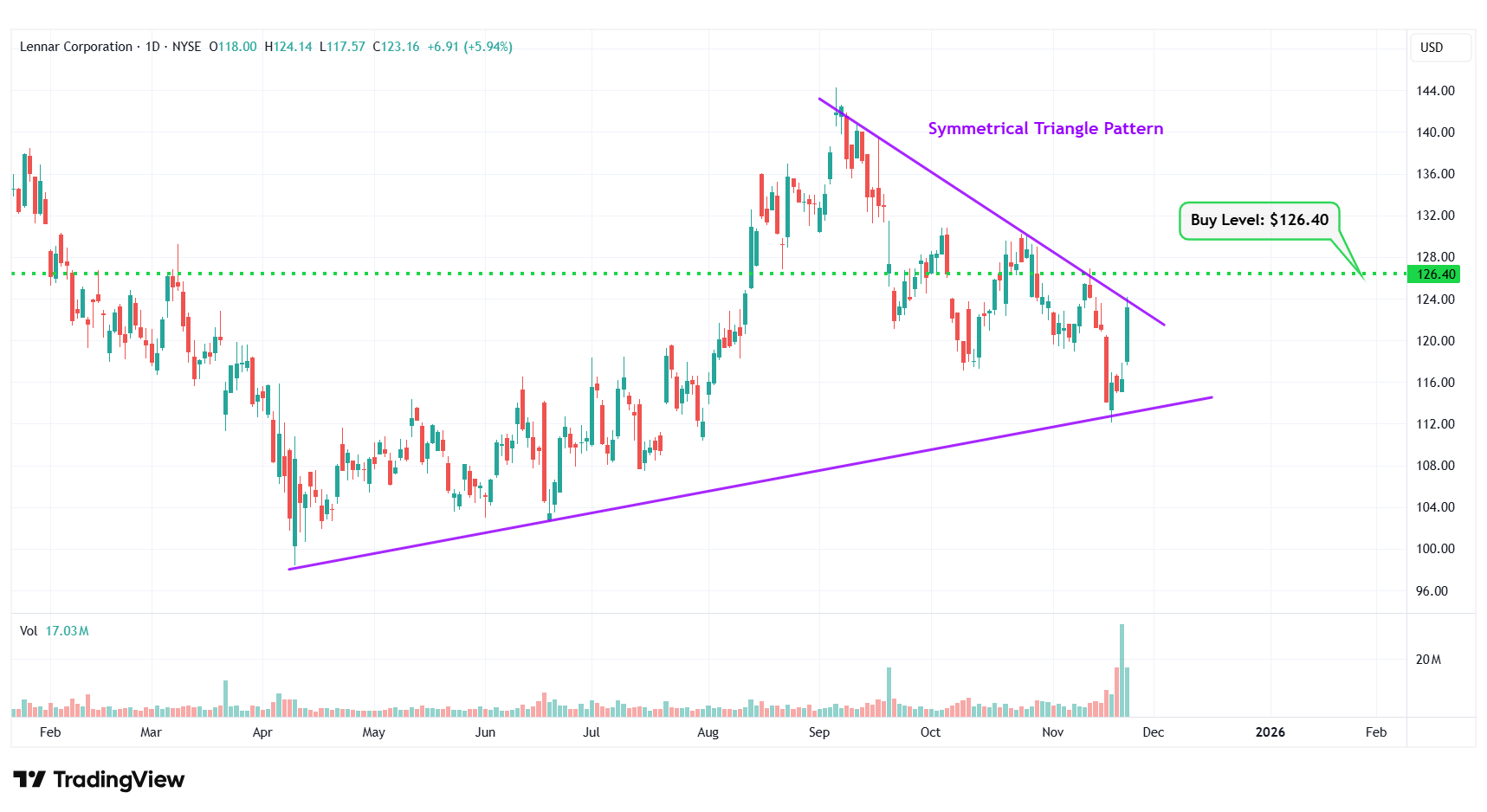 | 4 | Lennar Corp | NYSE: LEN | $123.16 | $126.40 | Symmetrical Triangle Pattern |